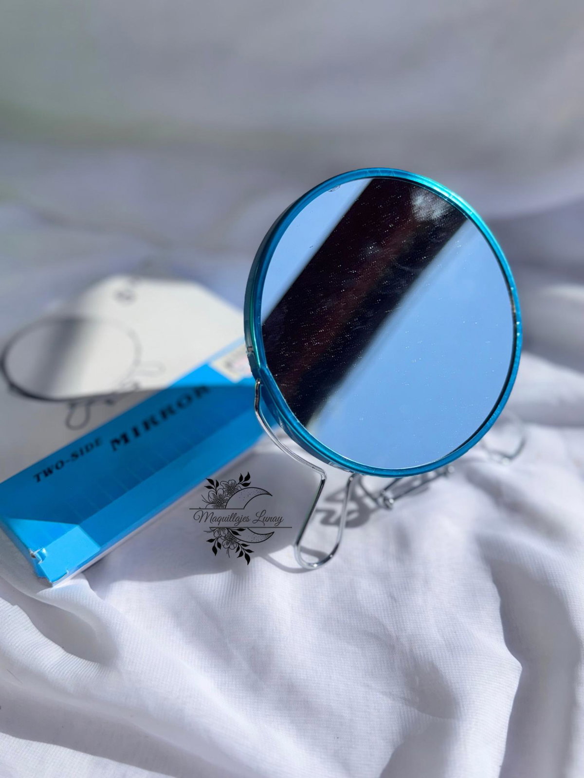 El espejo doble de 5 pulgadas cuenta con dos caras: una de reflejo normal y otra con aumento, ideal para detalles de maquillaje, depilación o cuidado facial. Viene con base incorporada para apoyarlo de forma segura sobre cualquier superficie, permitiéndote usar las manos libres mientras te arreglás.