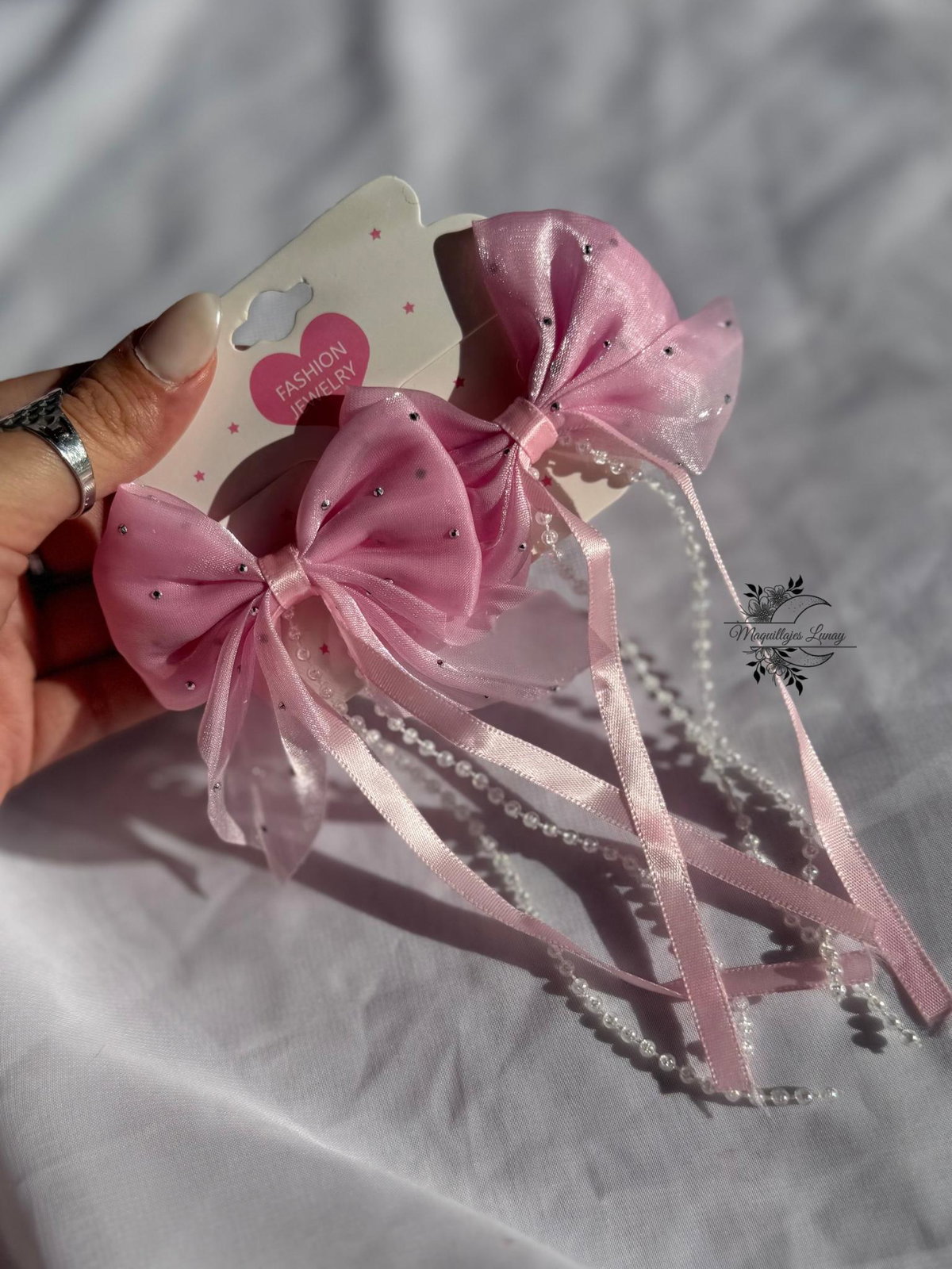 ¡Un accesorio tan tierno como especial! Estas colitas con moño están hechas de gasa brillosa y decoradas con strasses que le dan un toque de brillo encantador. Además, traen tiritas colgantes de perlas y cintas que las hacen aún más delicadas y soñadas.
