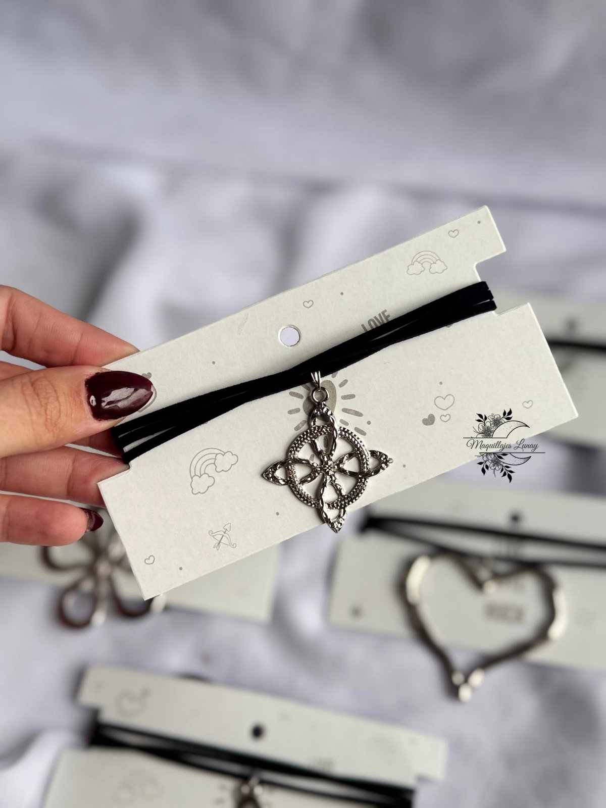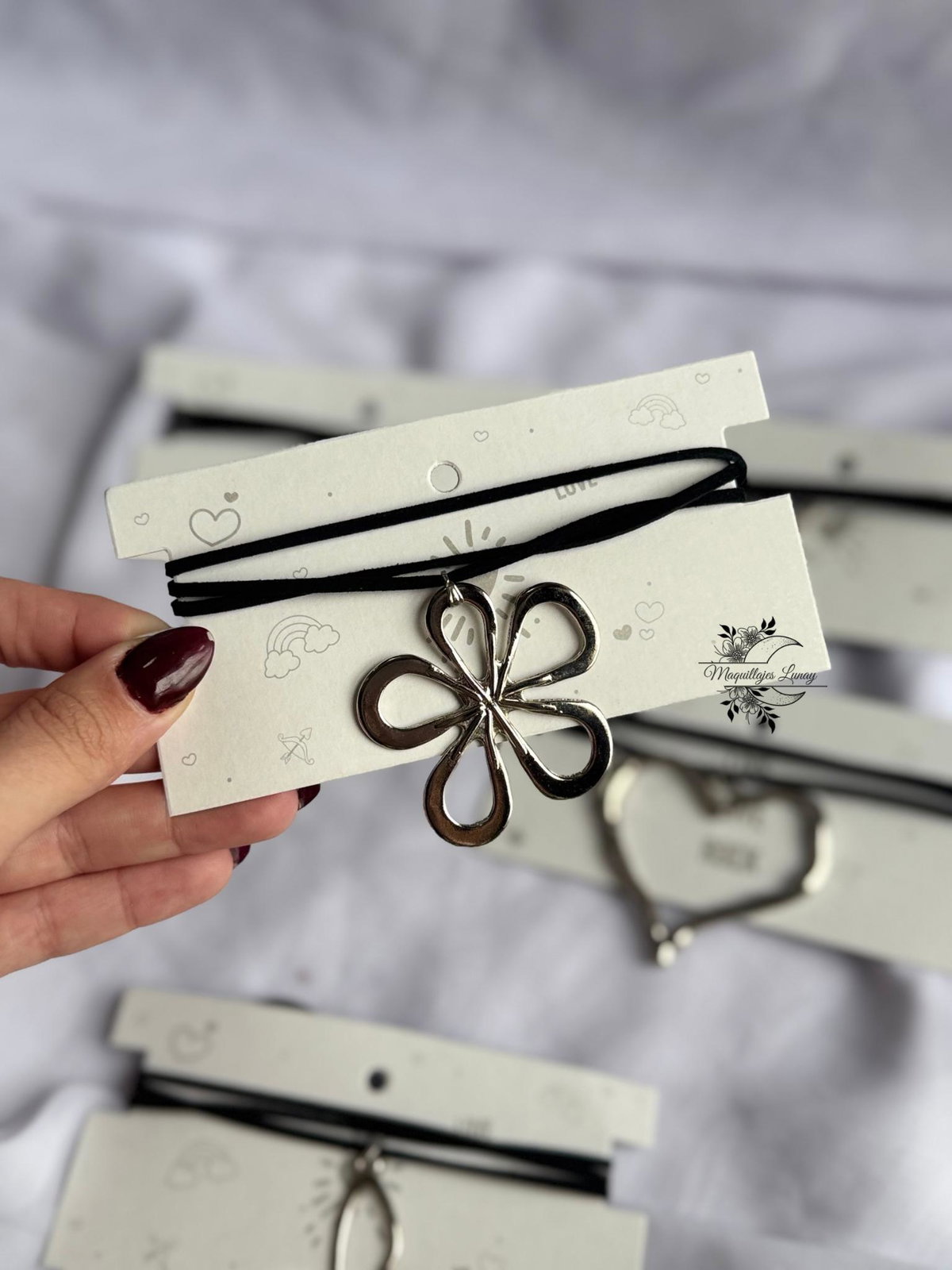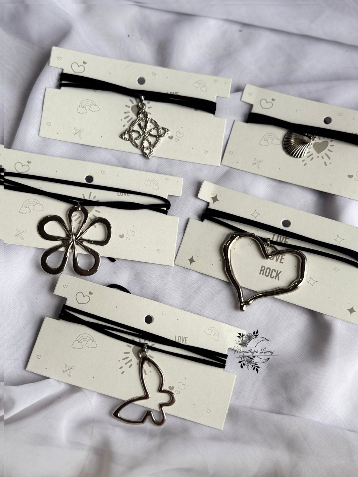 Accesorios versátiles, livianos y con mucha onda. Cada choker está hecho con cordón de gamuza negra y dijes metálicos con formas que marcan estilo: mariposa, corazón, flor, caracola, símbolo celta y más.