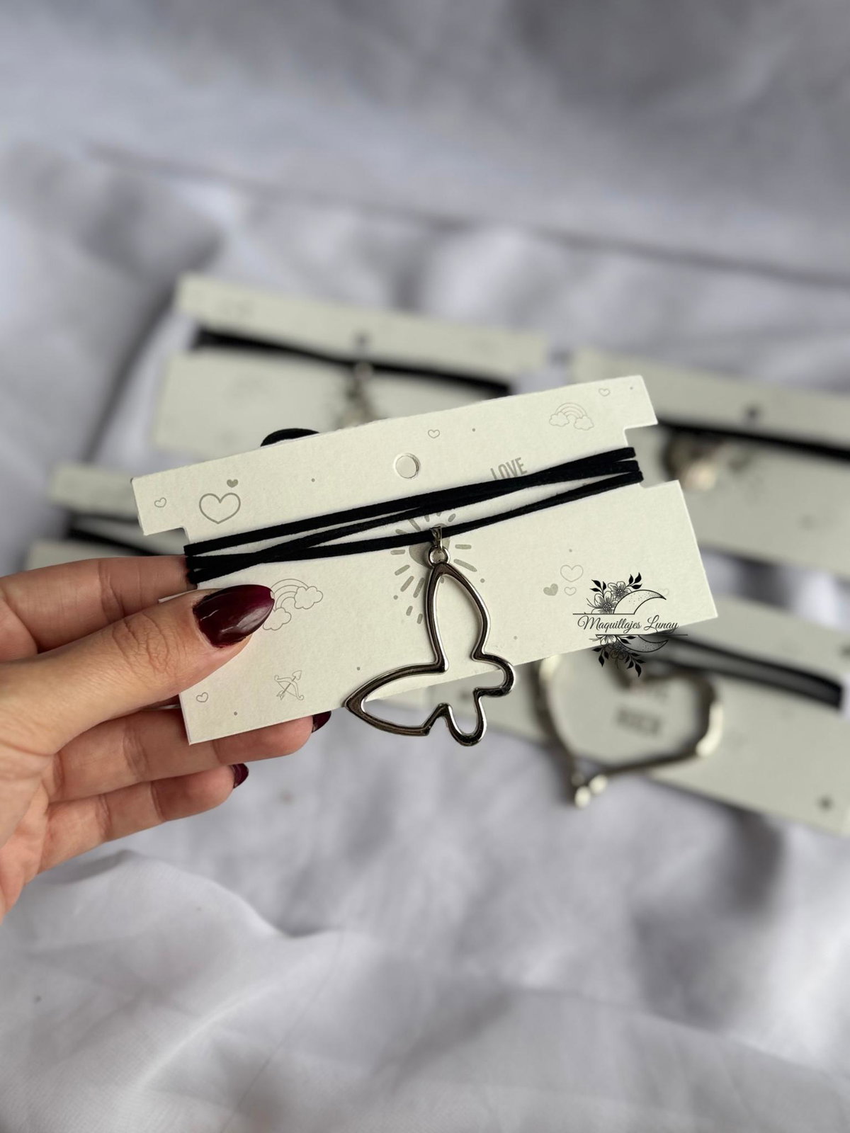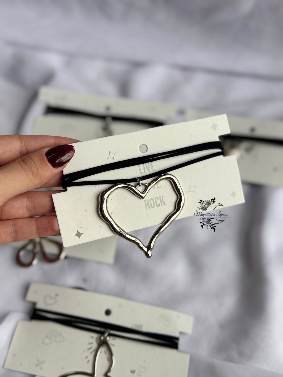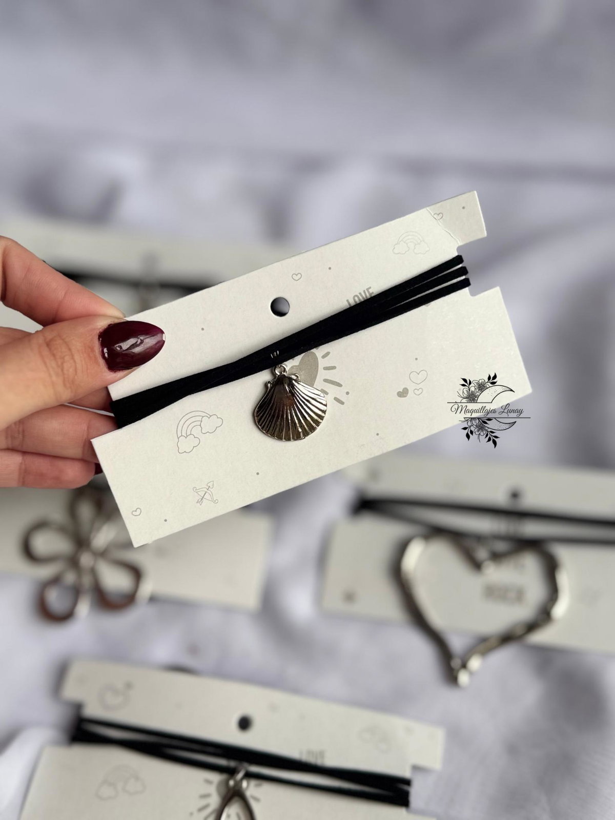 Accesorios versátiles, livianos y con mucha onda. Cada choker está hecho con cordón de gamuza negra y dijes metálicos con formas que marcan estilo: mariposa, corazón, flor, caracola, símbolo celta y más.