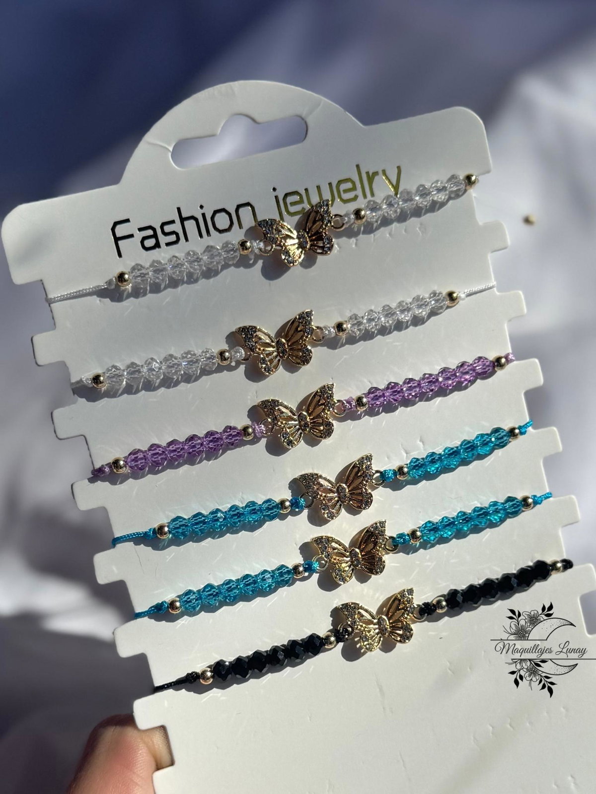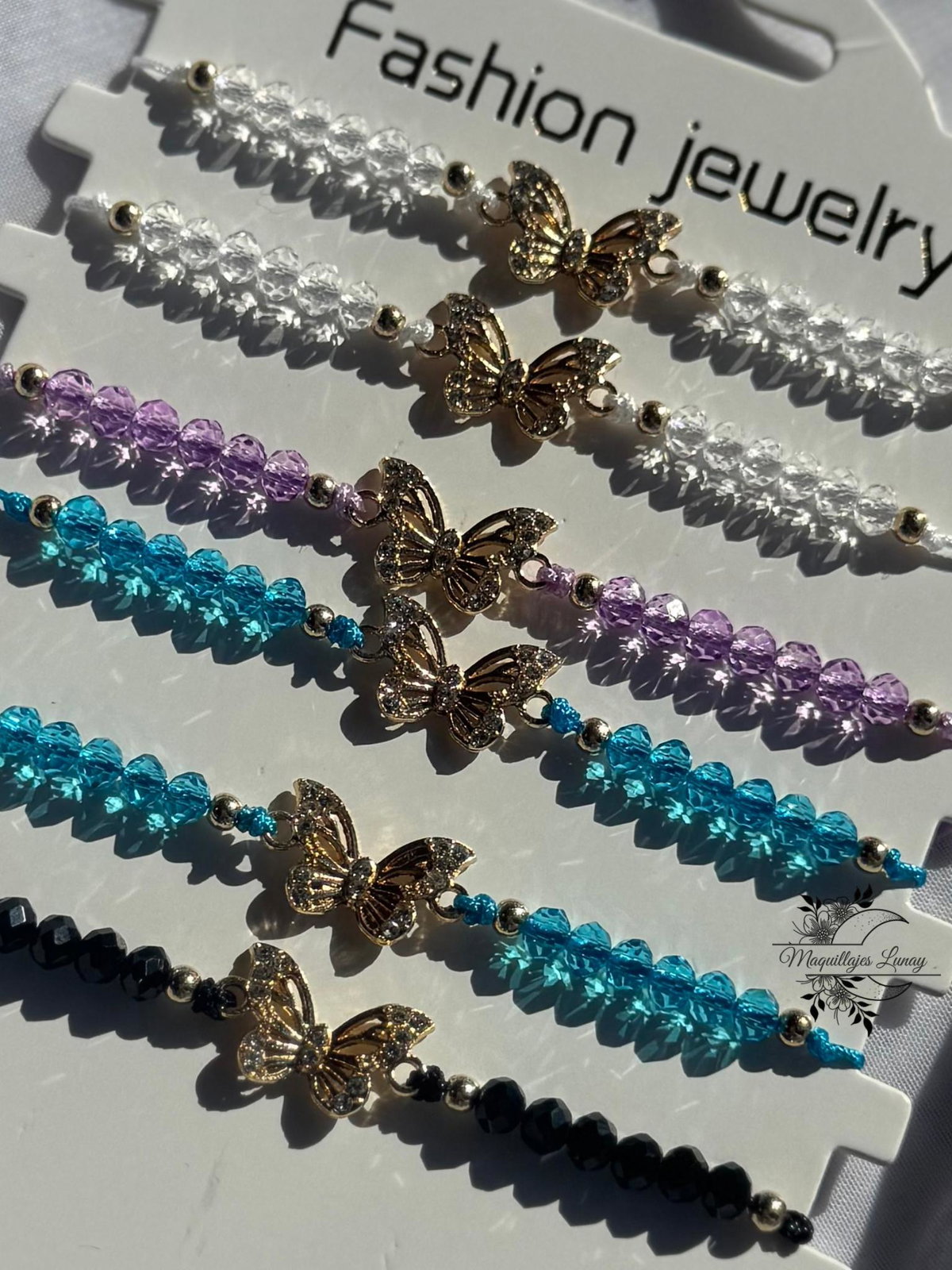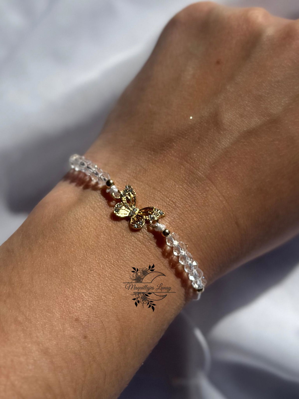 Nuestra pulsera de hilo con piedritas es el detalle que suma intención y estilo a tu día. Tiene un dije central de mariposa dorada con mini brillos, símbolo de transformación, libertad y renacer.