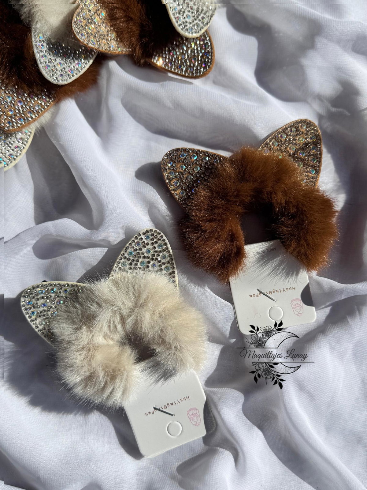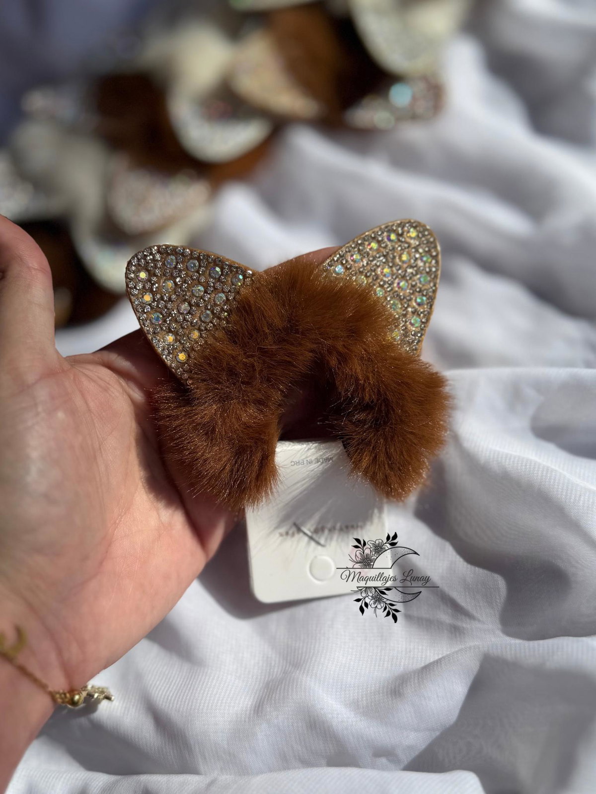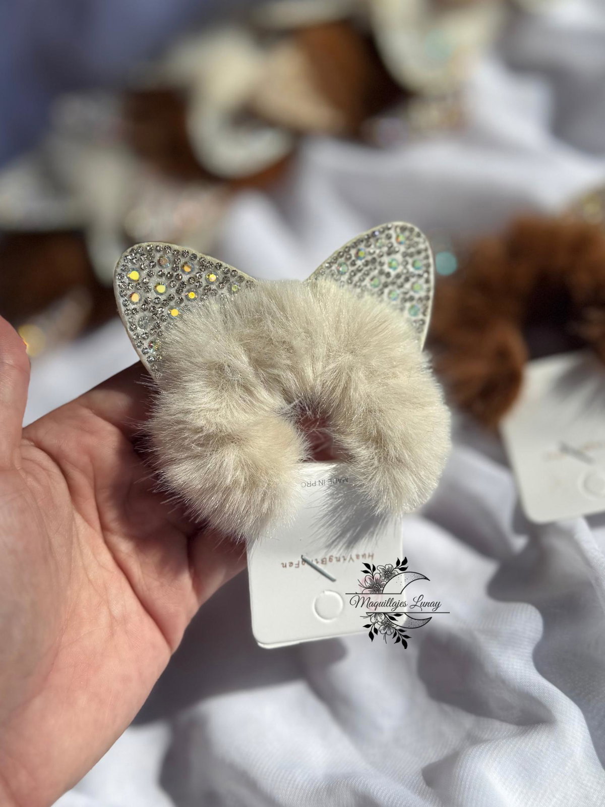 Esta colita está hecha en peluche suave, disponible en color crema o marrón, y decorada con orejitas adorables y detalles de strass que le dan un toque brillante y especial. Perfecta para acompañar sus looks con estilo y comodidad, cuidando su cabello con mucho cariño.