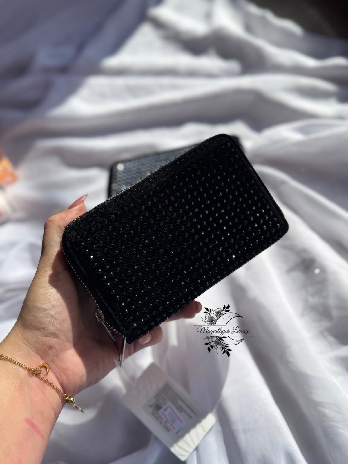 Esta billetera de tamaño mediano está confeccionada en gamuza negra suave, y su frente está completamente decorado con brillos de strass que le dan un toque glam y sofisticado. Con diseño de doble piso, ofrece amplio espacio para organizar tarjetas, billetes y monedas sin perder el estilo. Ideal para llevar en la mano o dentro del bolso.