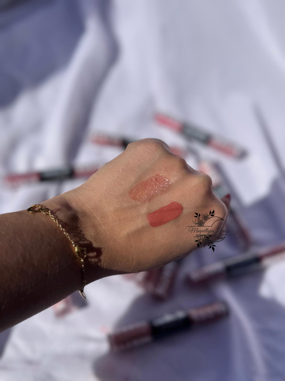 El lip combo que estabas esperando. De un lado, un labial matte con alta pigmentación y acabado aterciopelado. Del otro, un gloss en el mismo tono pero con glitter para darle ese toque brillante y glam.