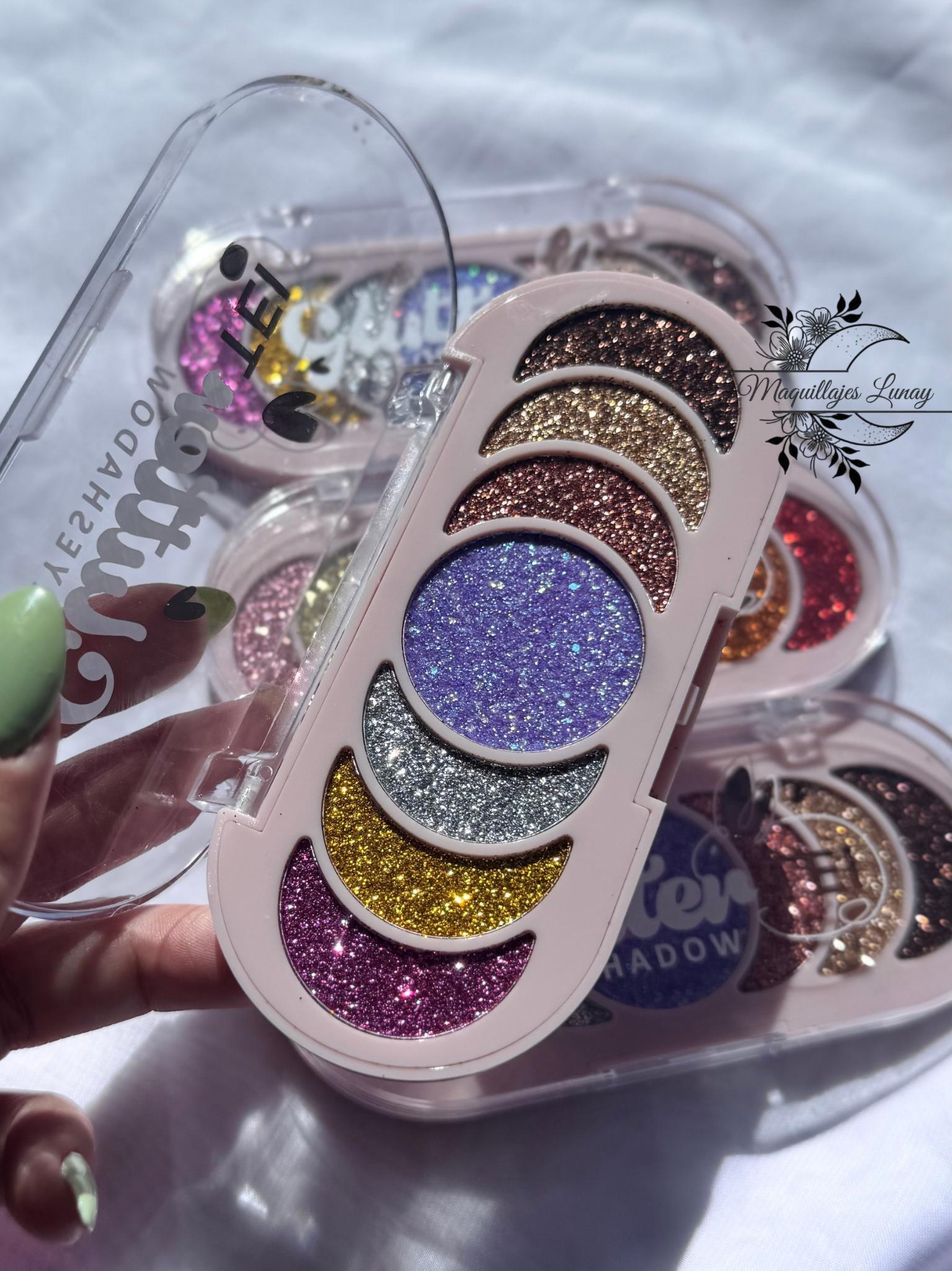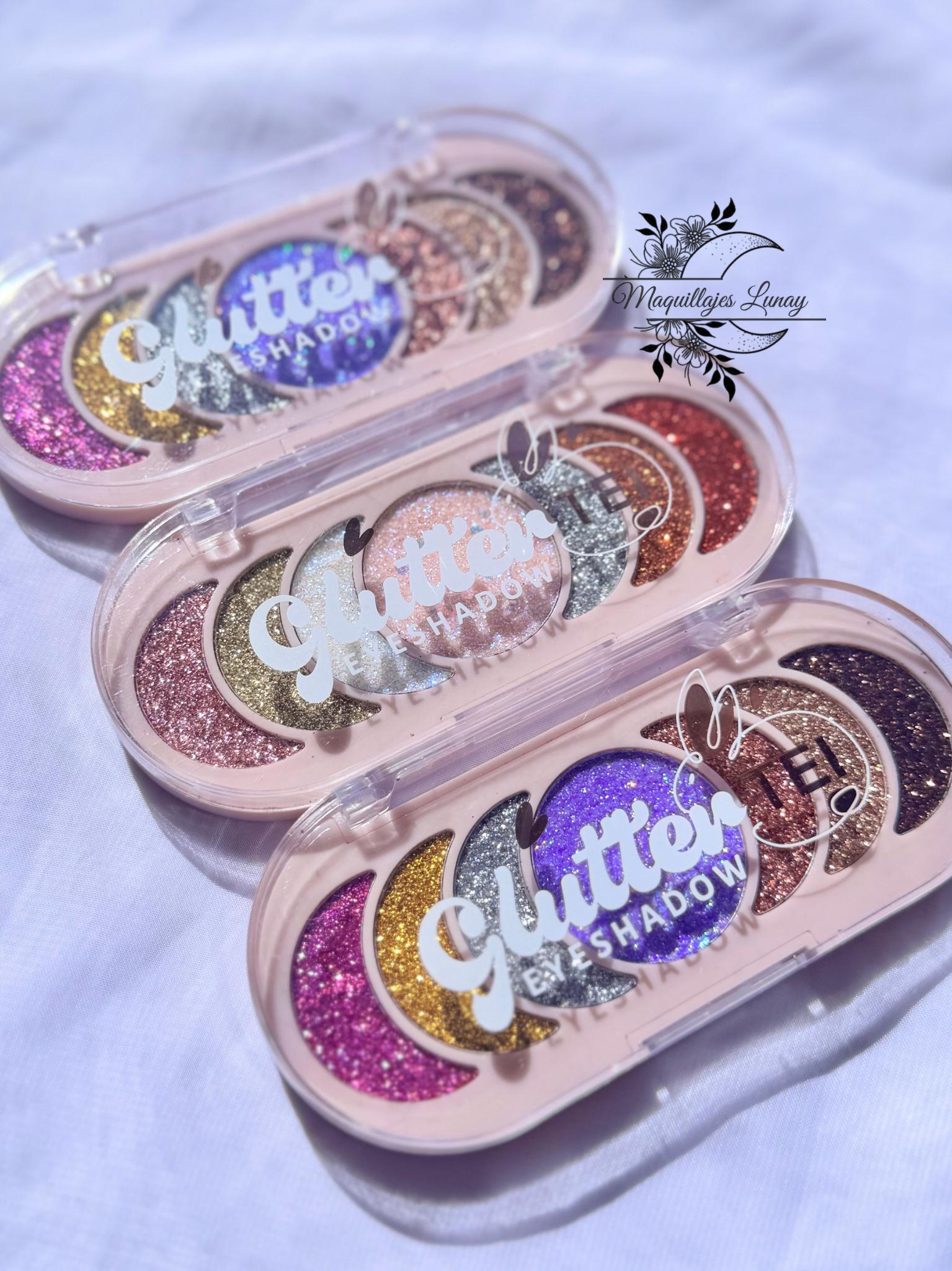 La paleta ideal para las amantes del brillo 💖. Viene con 7 tonos de glitter prensado, combinando colores neutros como plateado y dorado (que van con todo) junto con tonos vibrantes que varían según la paleta elegida: violeta, blanco, fucsia, cobre, entre otros.