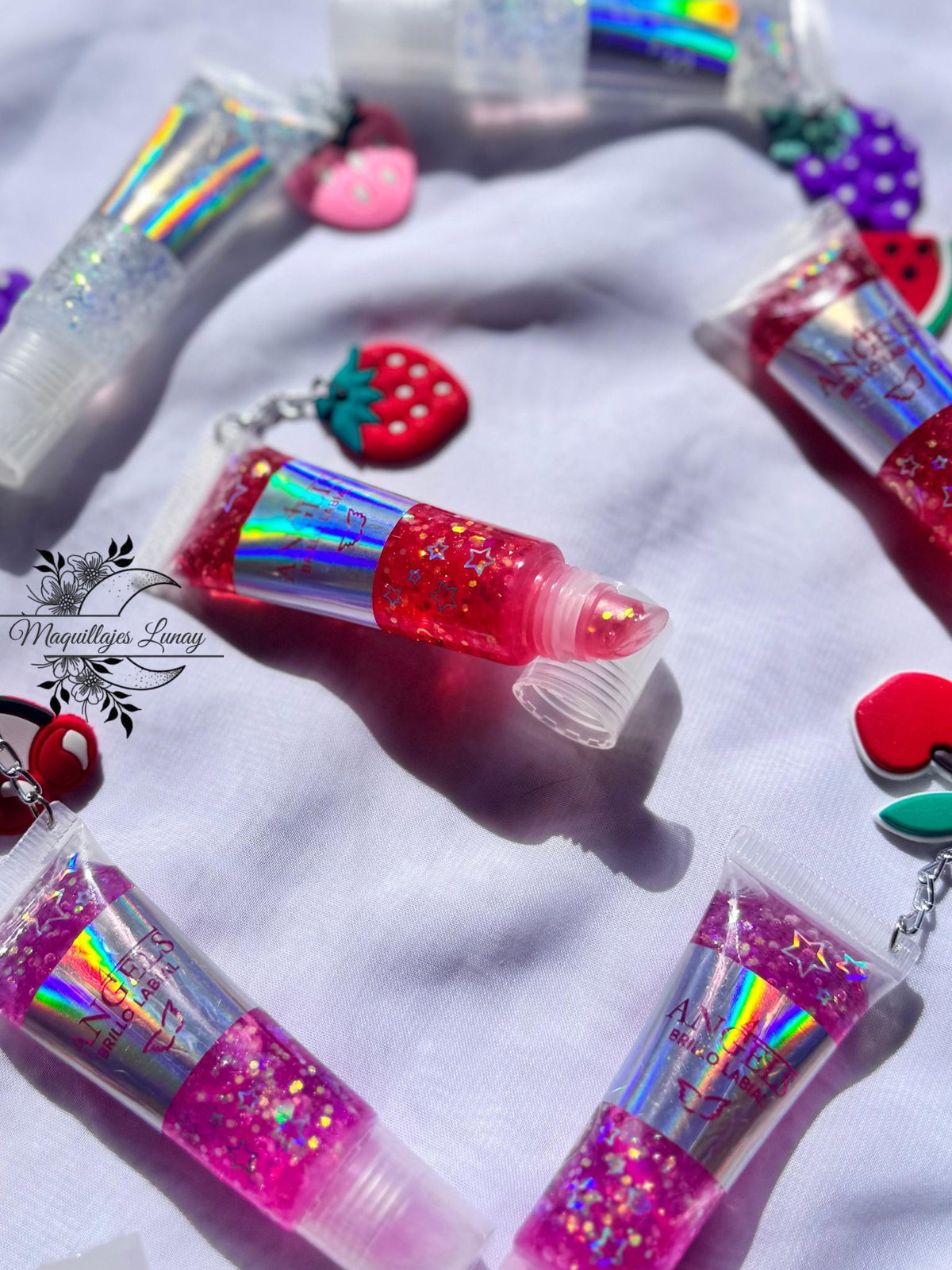 Gloss con llavero de frutas – 4 Angels 🍓🍍🍊