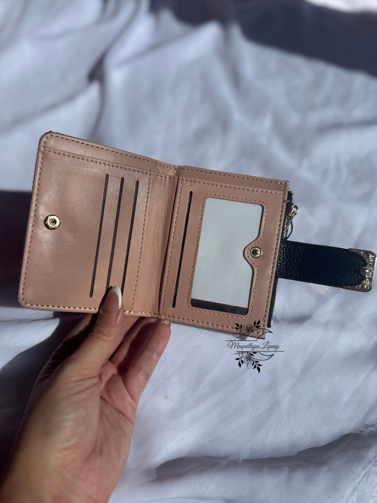 Cuenta con varios compartimentos internos para tarjetas, billetes y documentos, además de un monedero con cierre independiente, ideal para guardar tus monedas de forma práctica y segura.