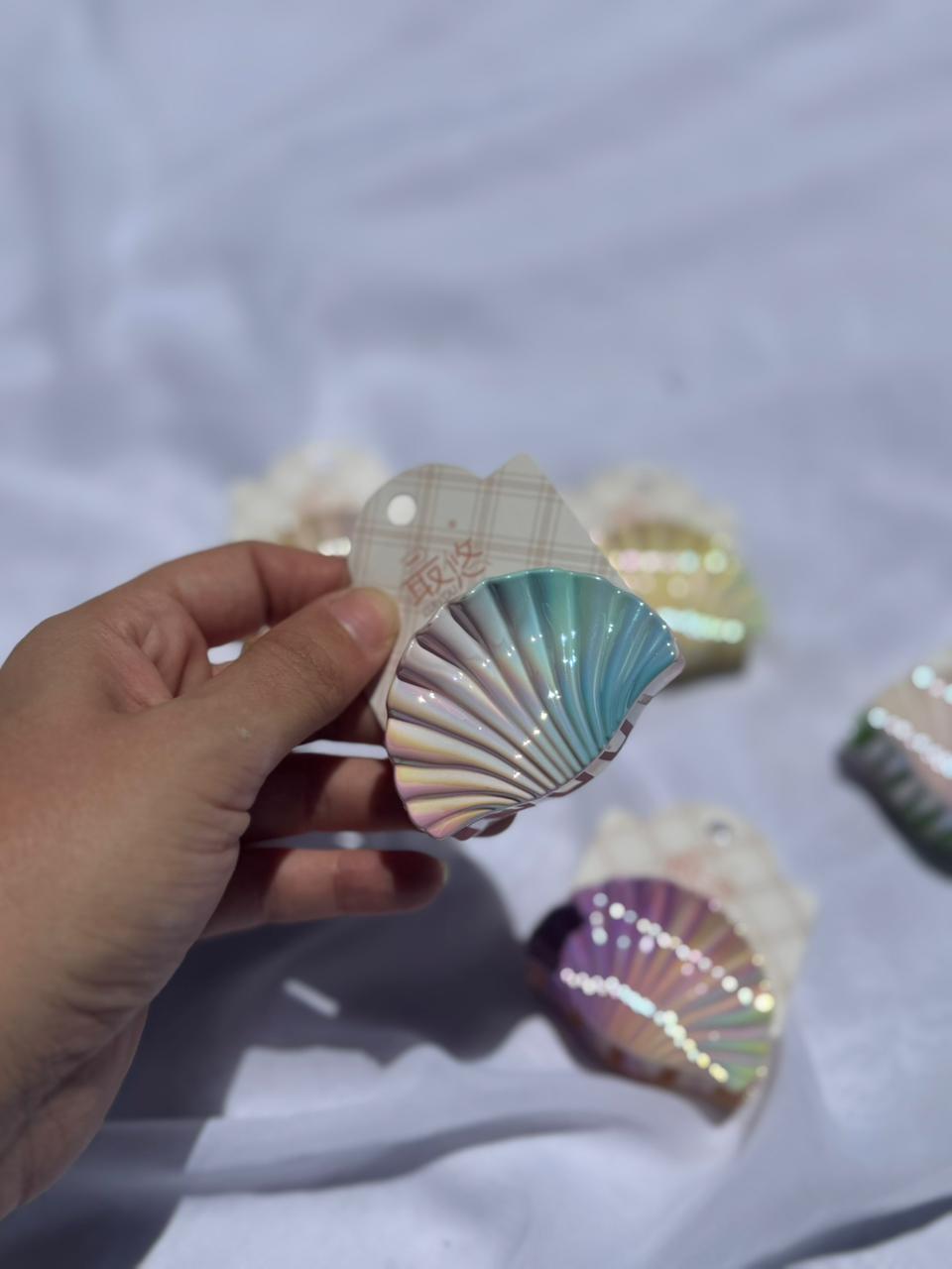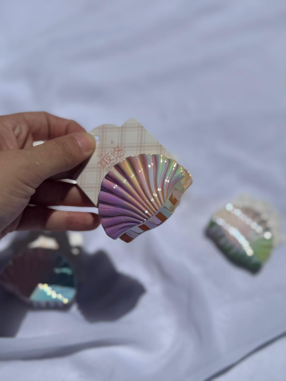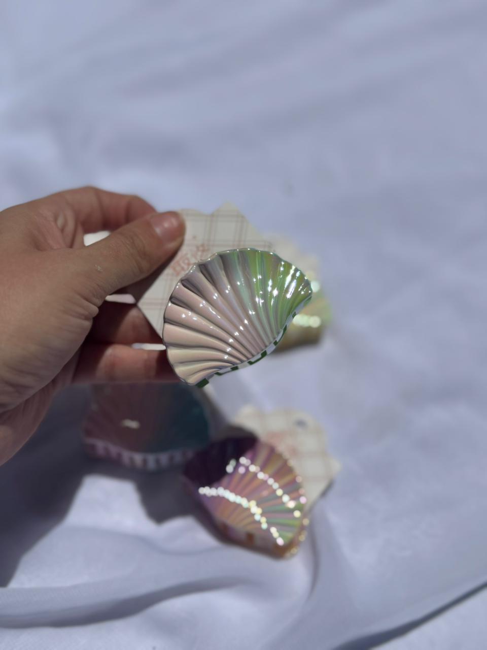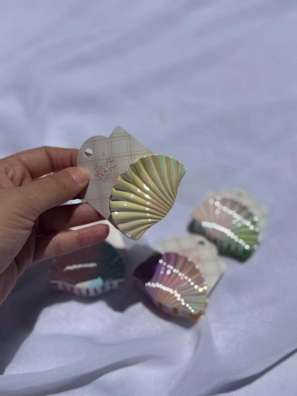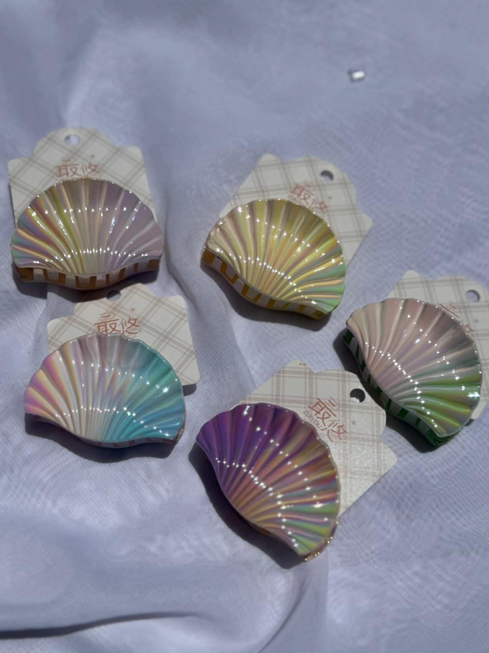 Broches con diseño de ostra, acabado tornasol y combinación de colores. Ideales para sumar un detalle original y luminoso a tus peinados. Livianos, prácticos y perfectos para usar todos los días o en looks más especiales.